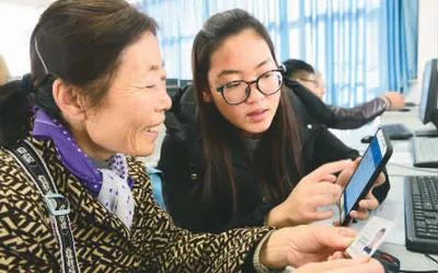 江蘇省鎮(zhèn)江市潤州區(qū)七里甸社區(qū)聯(lián)合江蘇科技大學(xué)成立老年網(wǎng)校,幫助老人們快樂上網(wǎng),豐富文化生活。下圖為志愿者向老年居民傳授智能手機(jī)上網(wǎng)購票技能。